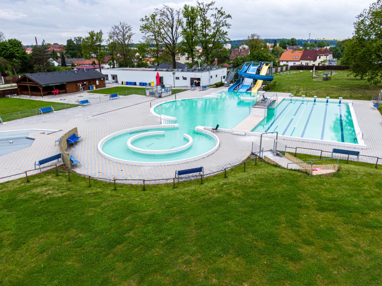 Tobogány, brouzdaliště, hřiště, občerstvení.